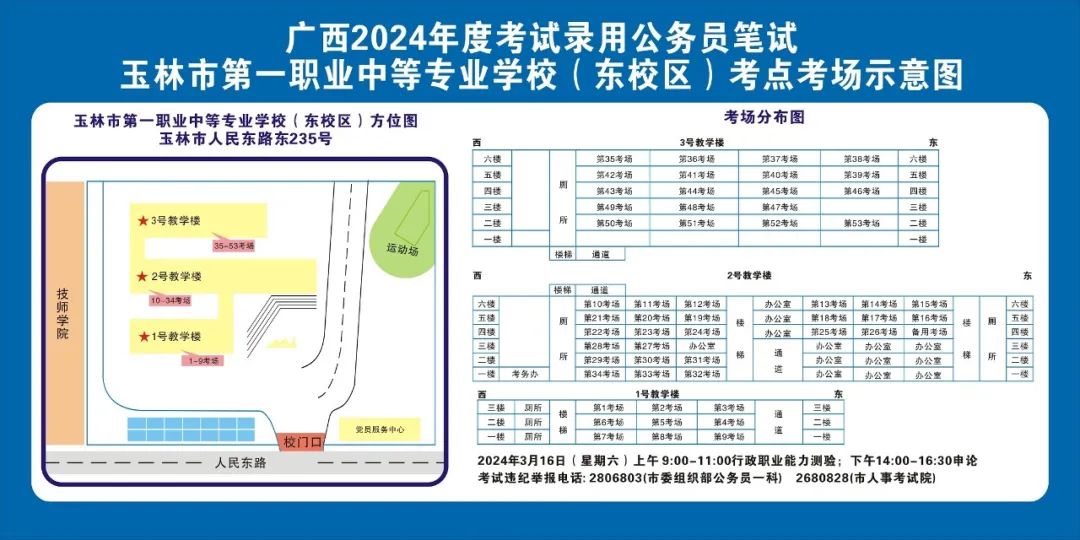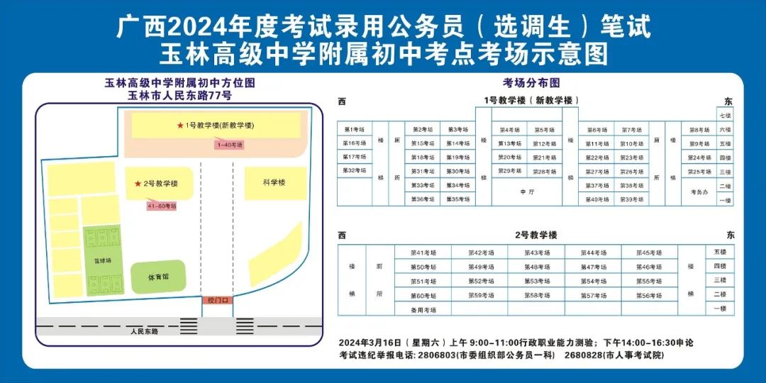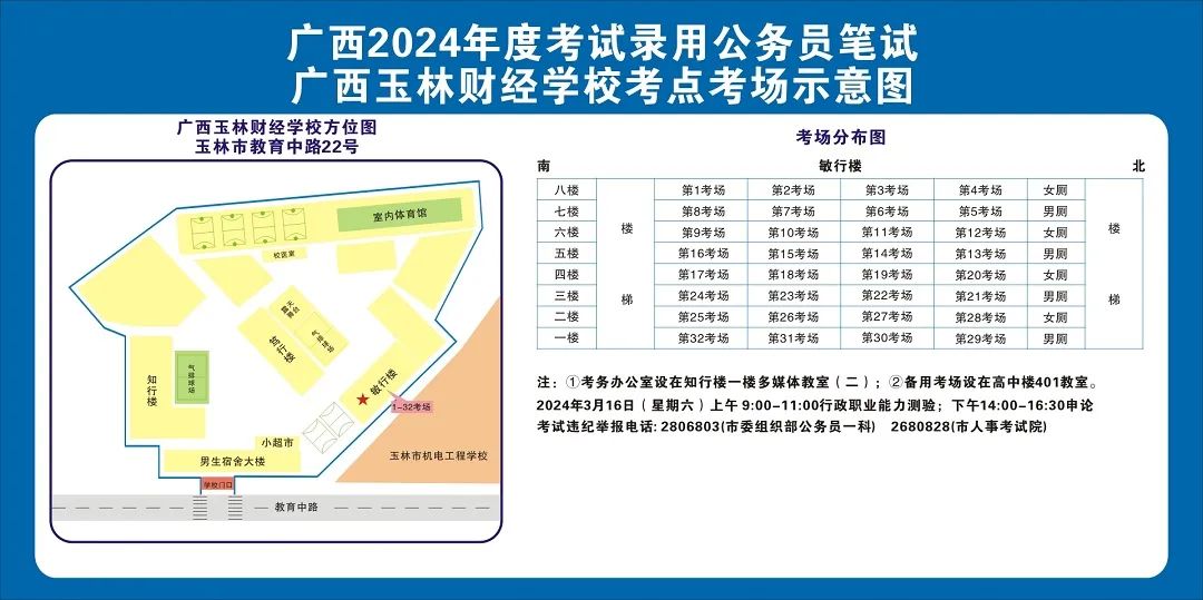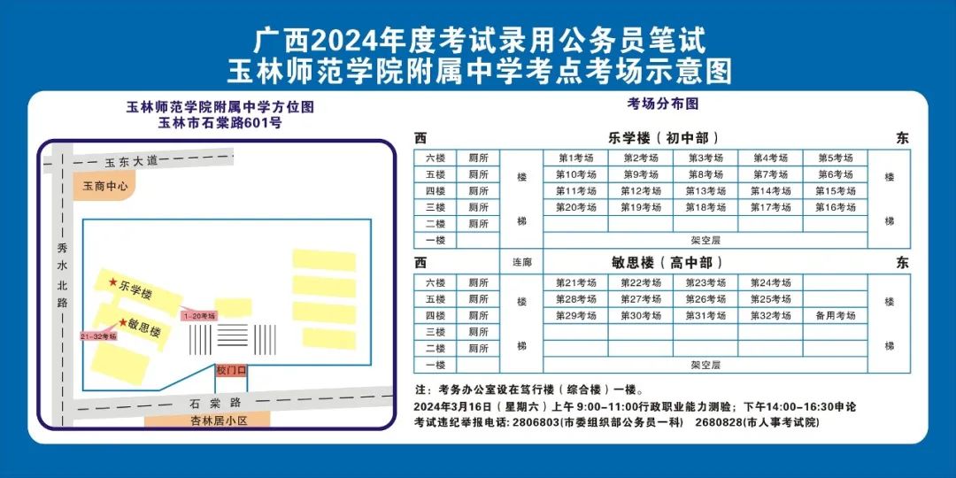 除考試當天考生可以進入考點外,考生不得提前進入考點查看考場(學(xué)校將在大門處擺放考場分布示意圖),玉林考區(qū)10個考點的考場布置情況如下:
