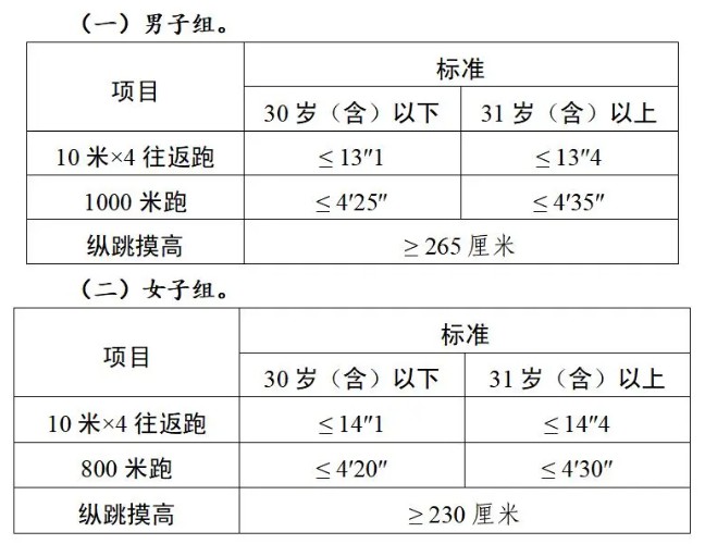 體能測評三項(xiàng)全部達(dá)標(biāo)方為合格。報考緊缺職位的人員,體能測評三項(xiàng)中有二項(xiàng)達(dá)標(biāo)的,視為合格。其中:縱跳摸高的測試次數(shù)不超過3次,10米×4往返跑的測試次數(shù)不超過2次,1000米跑/800米跑的測評次數(shù)為1次。