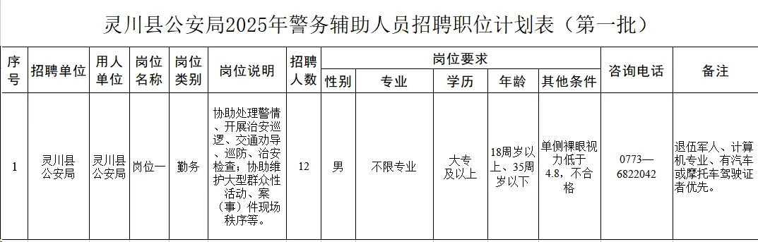 靈川縣公安局2025年第一批警務(wù)輔助人員招聘12人