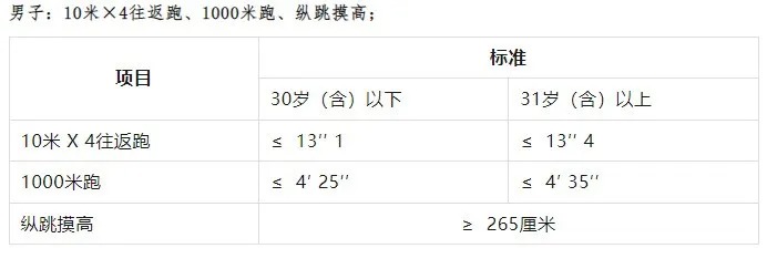 2.體能測評項目和標(biāo)準(zhǔn)按照《公安機關(guān)錄用人民警察體能測評項目和標(biāo)準(zhǔn)(暫行)》執(zhí)行。體能測評標(biāo)準(zhǔn)報考人員須參加全部三項體能測評,全部達標(biāo)方為合格,如放棄一項則視為不合格,體能測評合格的方可進入下一環(huán)節(jié)。