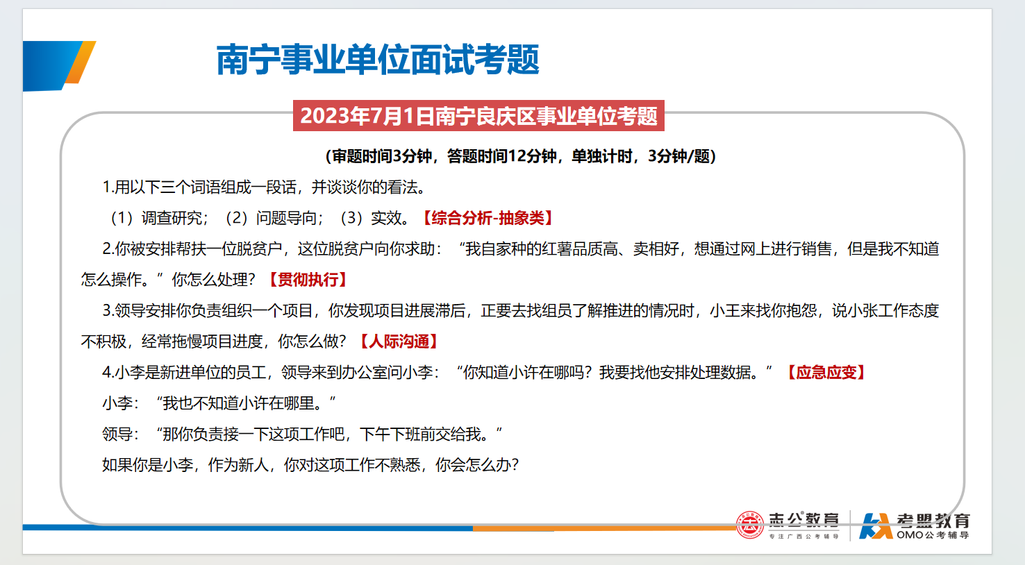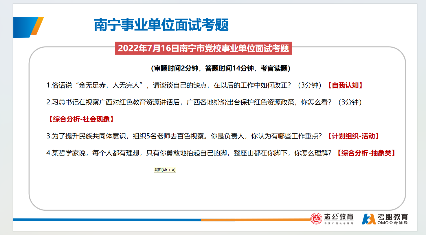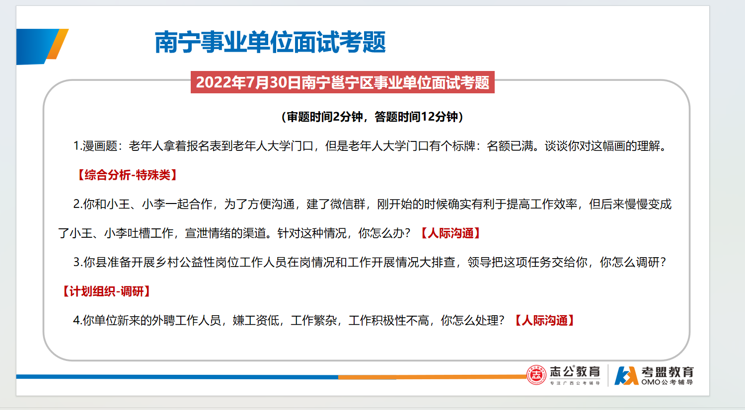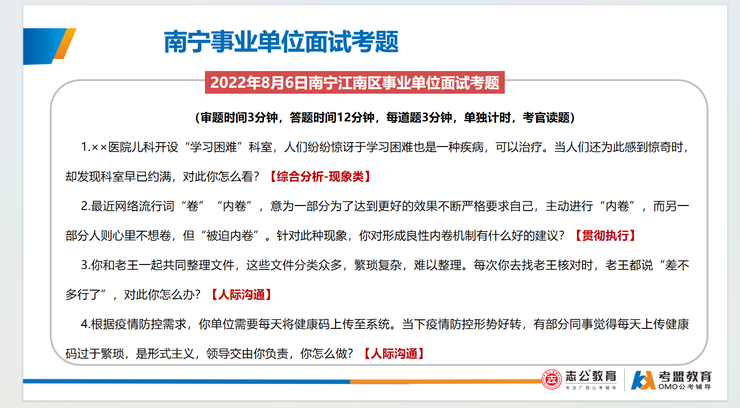 南寧事業(yè)單位面試主要采用結(jié)構(gòu)化面試形式、考查題量有3-4題,答題時間為9-12分鐘,考查題型:綜合分析(極高)、計劃組織(極高)、人際溝通(極高)、應(yīng)急應(yīng)變(一般)、貫徹執(zhí)行(一般)、自我認知(一般):