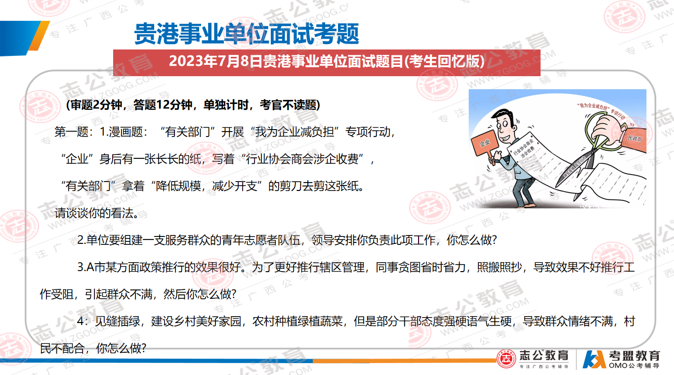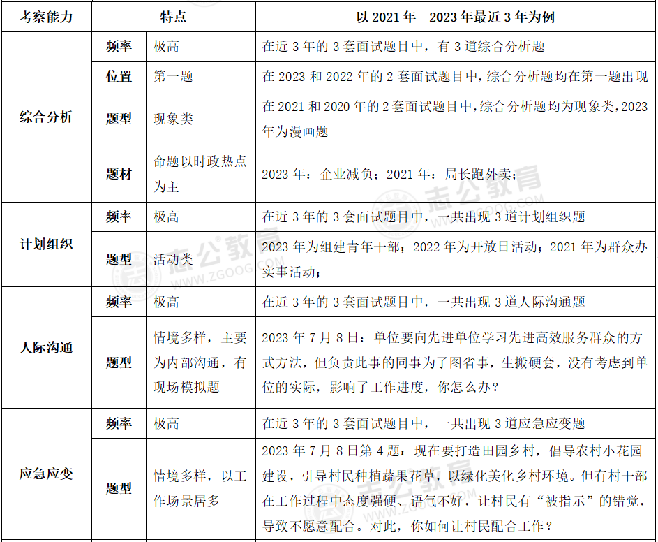貴港事業(yè)單位面試主要采用結(jié)構(gòu)化面試形式;審題時間:2分鐘;答題時間:12分鐘;考查題量:4題為主??紕涨闆r:考官不讀題、統(tǒng)一計時、超時會提醒。考查題型:綜合分析(極高)、計劃組織(極高)、人際溝通(極高)、應急應變(較高)、貫徹執(zhí)行(較高)、自我認知(一般)。