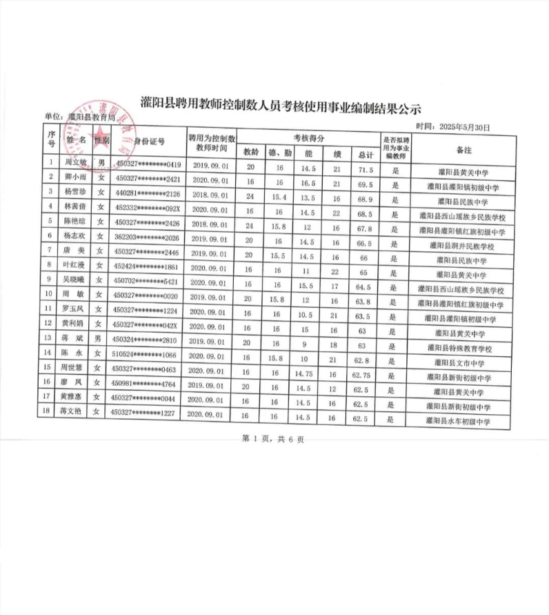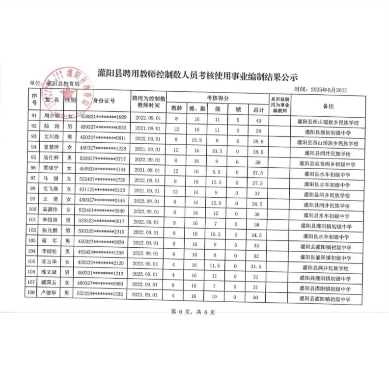 灌陽(yáng)縣聘用教師控制數(shù)人員考核使用事業(yè)編制結(jié)果公示