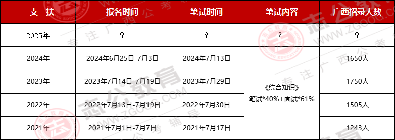 廣西什么時候出?正值畢業(yè)季,想必很多人想知道,根據(jù)下方圖片,廣西歷年三支一扶考試節(jié)點可知,三支一扶在六月底發(fā)公告,發(fā)布公告第二天開始報名,2024年招錄1650人,2023年招錄1750人,小志猜測,今年也就是2025年預(yù)計1700人。