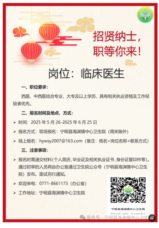 原文標(biāo)題:寧明縣海淵鎮(zhèn)中心衛(wèi)生院招聘信息