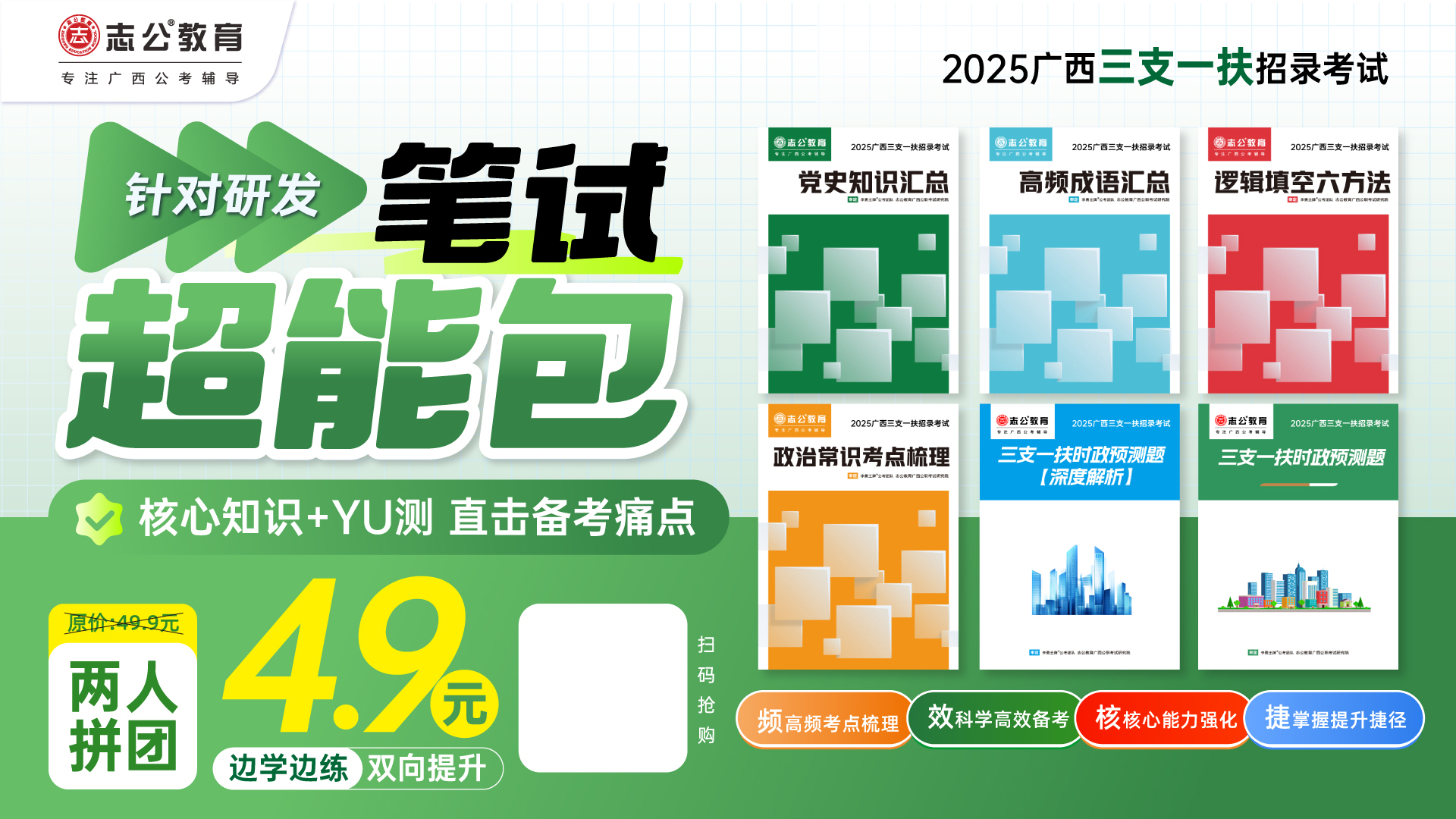 為助力青年群體高效備考,小志基于廣西地區(qū)歷年考試真題和考情分析,針對廣西地區(qū)“三支一扶”考試特點,精準(zhǔn)把握命題趨勢。內(nèi)容緊扣考試大綱,覆蓋綜合知識、公共基礎(chǔ)知識及崗位相關(guān)實務(wù),幫助考生高效掌握核心考點,為考生提供系統(tǒng)化、精準(zhǔn)化的備考支持。