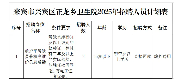 來賓市興賓區(qū)正龍鄉(xiāng)衛(wèi)生院2025開招聘非醫(yī)學類編外工作人員2人