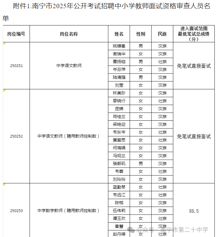 南寧市第二十中學(xué)2025年公開(kāi)考試招聘中小學(xué)教師面試入圍人選資格審查通知