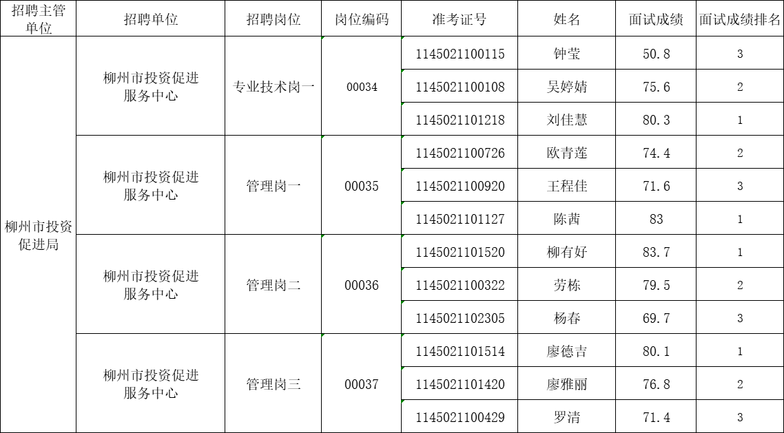 2025年柳州市投資促進局所屬事業(yè)單位公開招聘工作人員面試成績公示