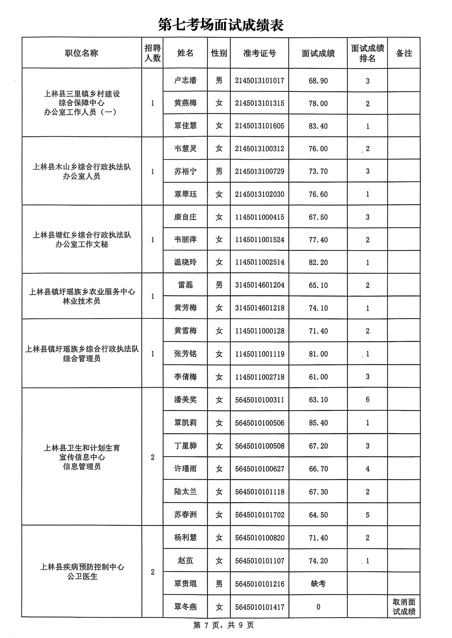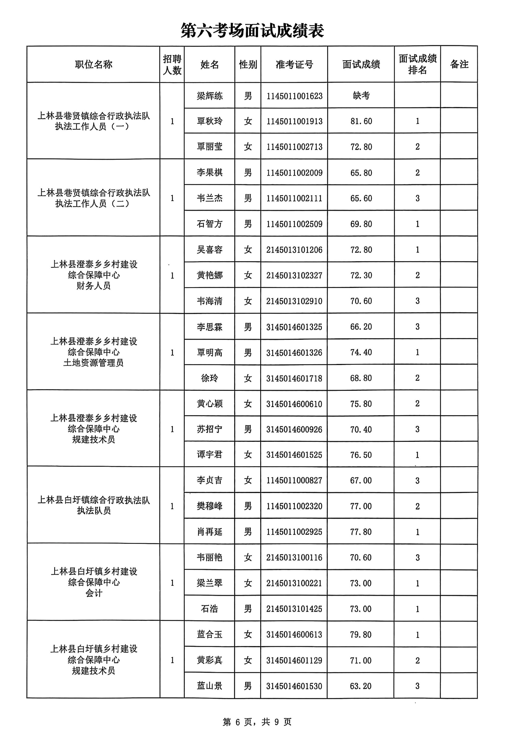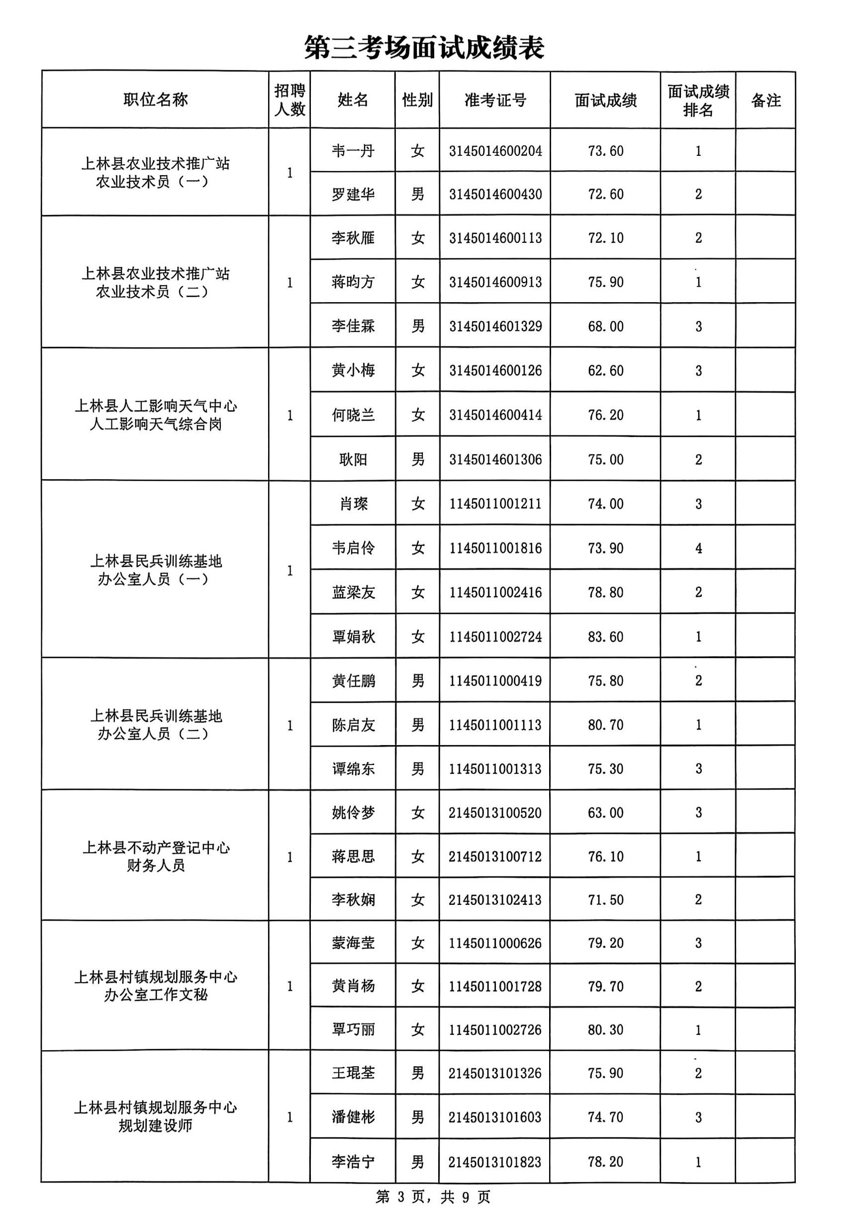 上林縣2025年公開考試招聘事業(yè)單位工作人員面試成績公布如下:
