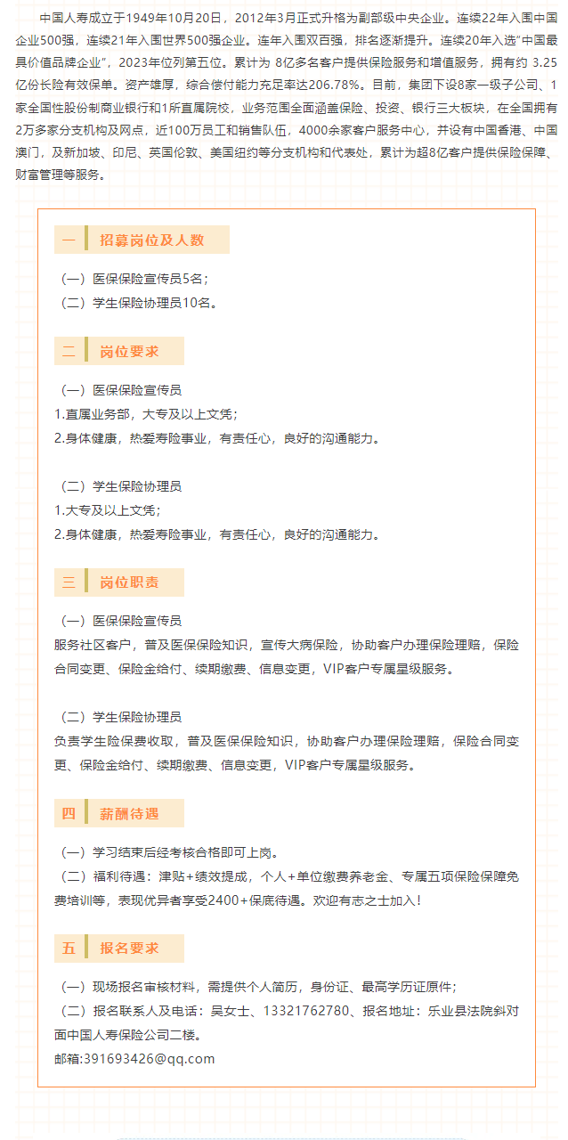 中國人壽保險(xiǎn)股份有限公司樂業(yè)支公司招募工作人員15名