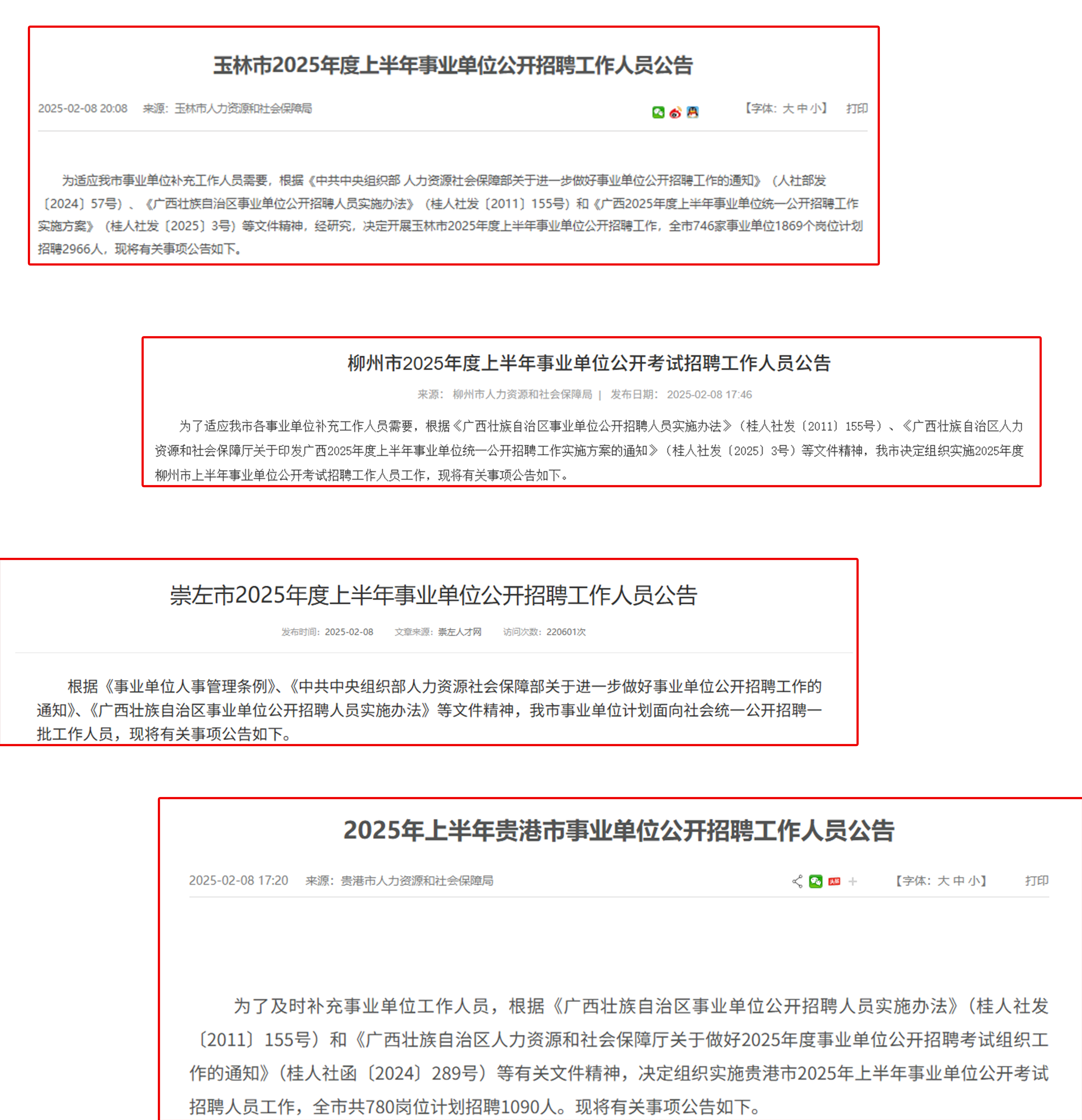 今年廣西極有可能會(huì)增加下半年的事業(yè)單位統(tǒng)招。我們?cè)谡韽V西上半年事業(yè)單位招聘公告時(shí),發(fā)現(xiàn)一件但有意思的事,玉林、崇左、柳州、貴港這4個(gè)地市發(fā)布公告時(shí)都用了“上半年”這個(gè)字眼。要知道,這在去年是沒有的~