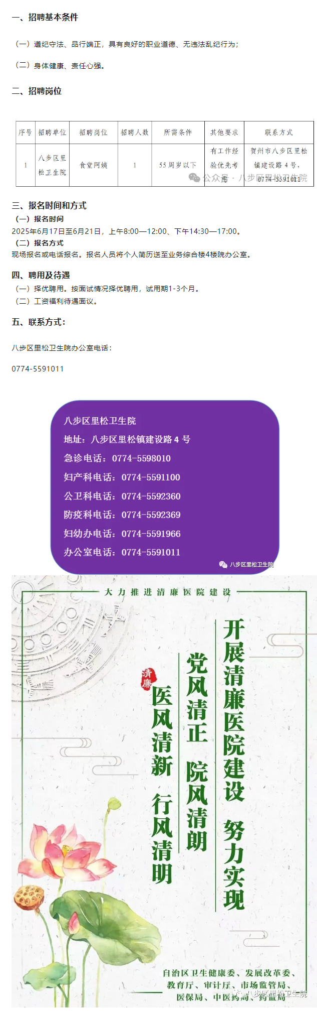2025年八步區(qū)里松衛(wèi)生院招聘食堂工作人員1人