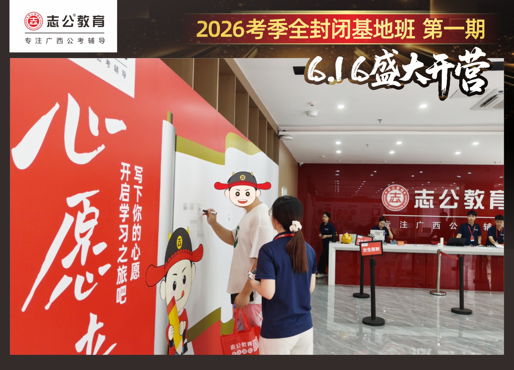 由于這段時間受臺風(fēng)影響,南寧迎來下雨天,但學(xué)員們滿懷先一步備考,快一步成功圓夢的滿滿炙熱信心,早早就在志公教育(中關(guān)村)全封閉基地前臺等候,6月16日,志公教育26考季全封閉基地班第1期的學(xué)員們齊聚一堂,正式開啟他們的公考備戰(zhàn)之旅。簽到環(huán)節(jié)作為基地班課程的第一站,不僅是對學(xué)員們的歡迎儀式,更是他們邁向夢想的第一步。