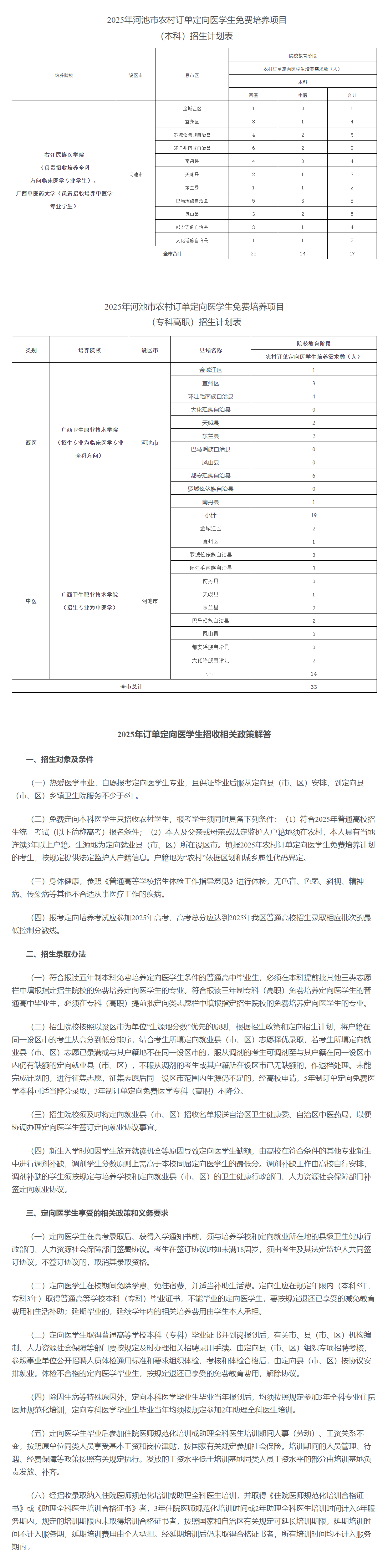 2025年,廣西繼續(xù)實施定向醫(yī)學(xué)生免費培養(yǎng)項目,面向全區(qū)招生。河池市共有80個名額,其中,本科47個,???3個,培養(yǎng)院校分別為:右江民族醫(yī)學(xué)院、廣西中醫(yī)藥大學(xué)、廣西衛(wèi)生職業(yè)技術(shù)學(xué)院,培養(yǎng)專業(yè)為臨床醫(yī)學(xué)和中醫(yī)學(xué)。