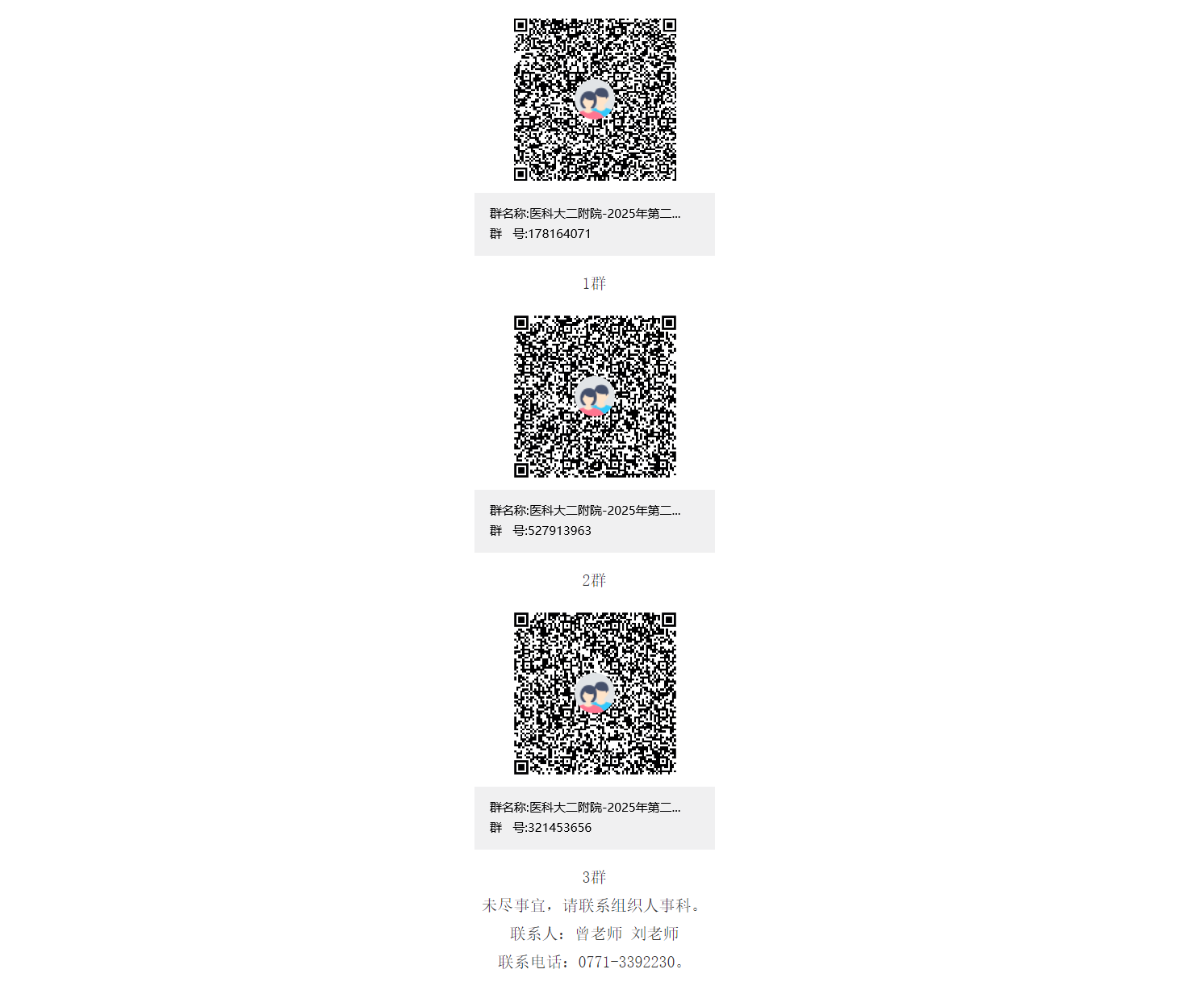 考核與面試的時間、地點另行通知,擇優(yōu)聘用。通過資格審核的考生名單及相關(guān)考試事宜將在“醫(yī)科大二附院-2025年第二批醫(yī)技藥行政招聘群”發(fā)布,請應(yīng)聘者務(wù)必進(jìn)群并關(guān)注群消息,不再另行通知。請通過搜索群號碼(1群:178164071、2群:527913963、3群:321453656)或掃碼加群(1群滿后請加2群、3群):