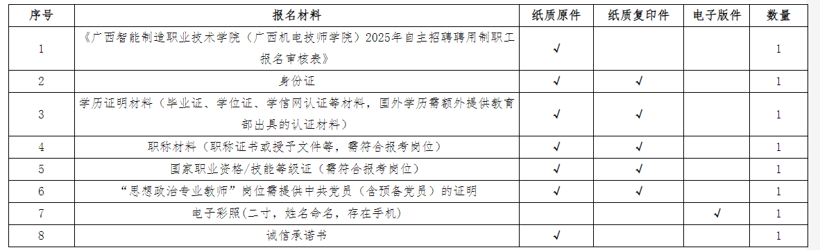 應(yīng)聘者按照招聘崗位具體要求對口報名,每名應(yīng)聘者限報一個崗位,采用現(xiàn)場報名遞交應(yīng)聘材料的方式報名。報名人員須下載并填寫《廣西智能制造職業(yè)技術(shù)學(xué)院(廣西機(jī)電技師學(xué)院)2025年自主招聘聘用制職工報名審核表》(附表2),同時需附上相應(yīng)的學(xué)歷、學(xué)位證書、身份證、職稱證書(相關(guān)崗位需要)等材料的原件與復(fù)印件(原件審核后退回,復(fù)印件不退回)