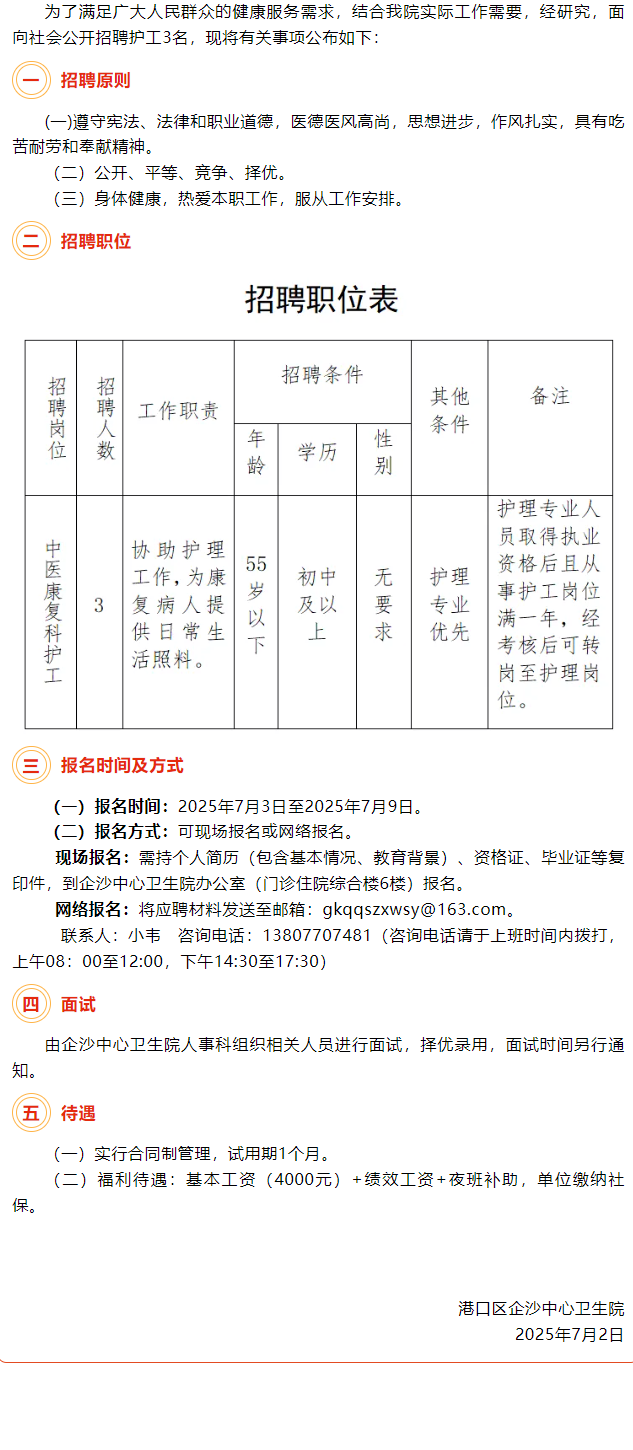 2025年港口區(qū)企沙中心衛(wèi)生院招聘護(hù)工(第二批)公告