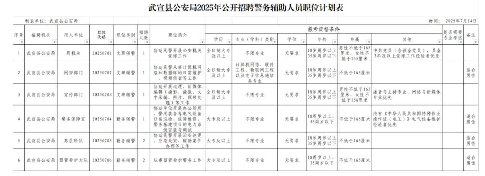 招聘人數(shù):8人,詳見《武宣縣公安局2025年第二次面向社會招聘輔警職位計劃表》(附件1)。