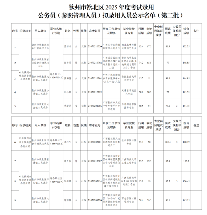 附件:欽州市欽北區(qū)2025年度考試錄用公務(wù)員(參照管理人員)擬錄用人員公示名單(第二批)