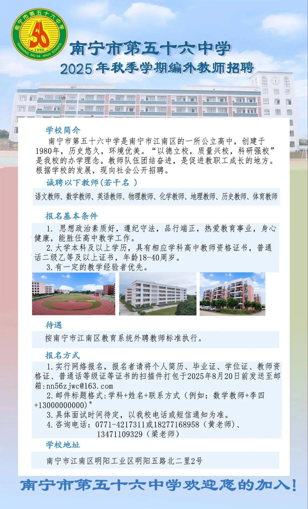 南寧市第五十六中學2025年秋季學期編外教師招聘