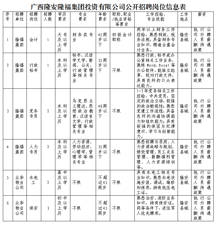 廣西隆安隆福投資集團(tuán)有限公司招聘公告