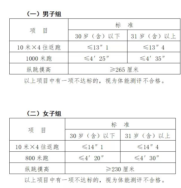 體測項(xiàng)目為縱跳摸高、10米×4往返跑和1000米(男)或800米(女)長跑,體能測試項(xiàng)目評(píng)分標(biāo)準(zhǔn)依據(jù)《公安機(jī)關(guān)錄用人民警察體能測評(píng)項(xiàng)目和標(biāo)準(zhǔn)(暫行)》執(zhí)行(見附件3),體能測試項(xiàng)目規(guī)則按照《公安機(jī)關(guān)錄用人民警察體能測評(píng)實(shí)施規(guī)則》執(zhí)行(見附件4)。