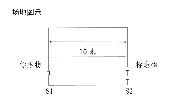 動(dòng)作要求:受測(cè)試者采用站立式起跑,聽到發(fā)令后從S1線外跑到S2線前(腳不得踩線)用手將豎立的木塊推倒后折返,往返跑2次,每次推倒1個(gè)木塊,第2次返回時(shí)沖出S1線。