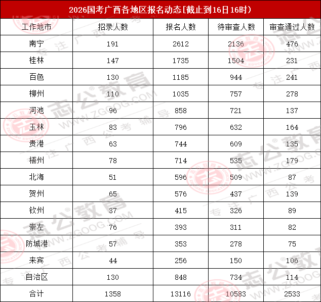 截止到16日16時(shí),2026國考廣西地區(qū)各地市報(bào)名人數(shù)最多的地市為南寧、桂林、百色,其中南寧報(bào)名人數(shù)為2612人,位居第一!整體報(bào)考人數(shù)達(dá)13116人!對(duì)此,小志建議大家,報(bào)考崗位時(shí)需將自身職業(yè)愿景與個(gè)人實(shí)際條件(如專業(yè)、學(xué)歷、基層經(jīng)驗(yàn)等)緊密結(jié)合,理性分析崗位競(jìng)爭(zhēng)情況,最終做出最適合自己的選擇。