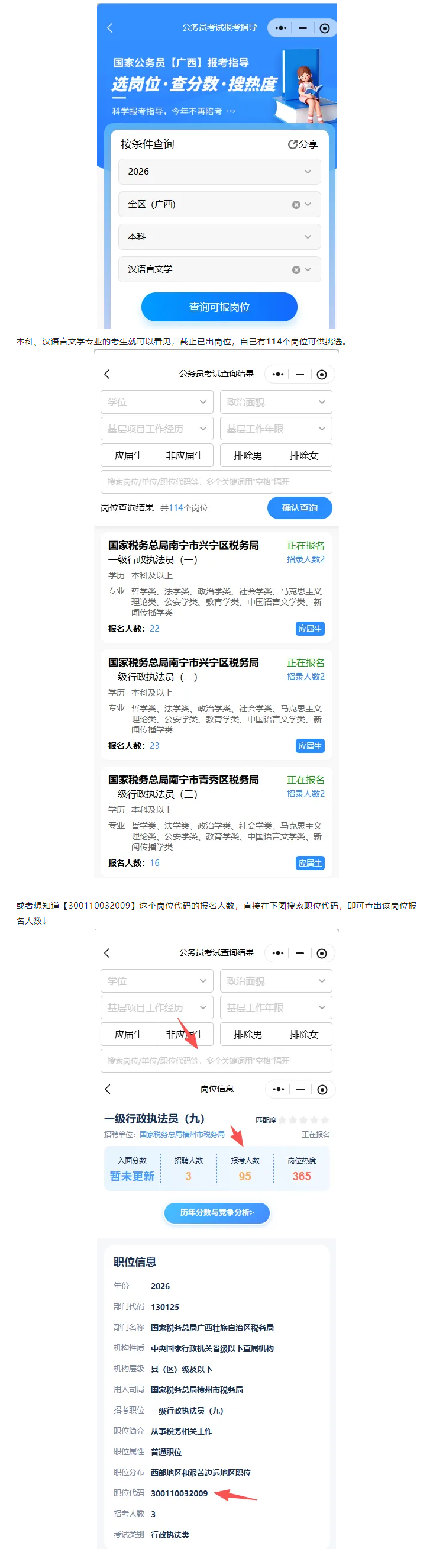 更多崗位報(bào)名詳細(xì)內(nèi)容請(qǐng)使用公考天眼查詢,在這里,你能清晰查看各個(gè)崗位的官方報(bào)考人數(shù)、本系統(tǒng)崗位熱度,崗位報(bào)名條件,入面分?jǐn)?shù)和錄取分?jǐn)?shù),這些數(shù)據(jù)都是經(jīng)過精準(zhǔn)整理與分析的,能為你的選崗提供有力參考。