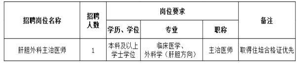 根據(jù)醫(yī)院發(fā)展需要,現(xiàn)面向社會急招肝膽外科主治醫(yī)師1人,有關(guān)招聘事項公告如下: