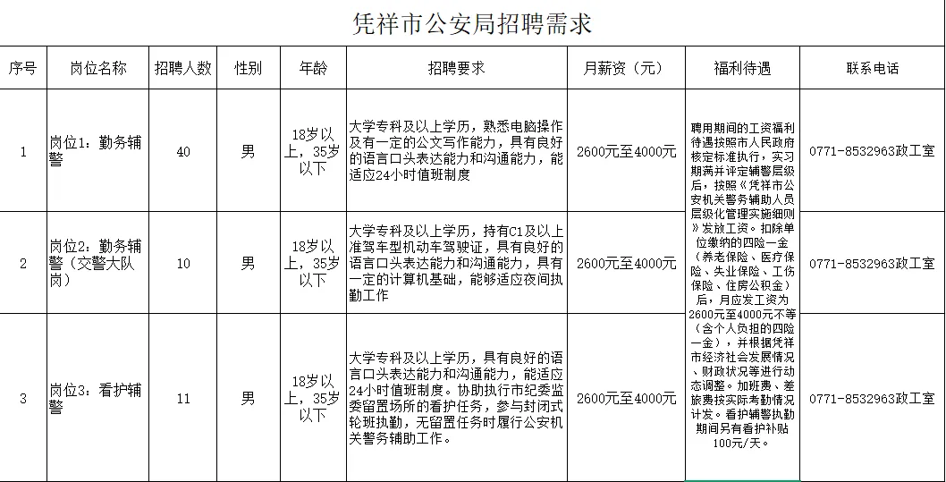 被聘用人員試用期為兩個月,試用期應(yīng)發(fā)工資為2600元/月(含個人負擔(dān)的四險一金)。期滿不能勝任工作崗位者,不再聘用;不滿一月的按日均計算報酬;輔警享受帶薪年休假、年度健康檢查、人身意外傷害保險等待遇。五、聯(lián)系方式:1、憑祥市公安局政工室 0771-85329632、憑祥市公安局交警大隊辦公室 0771-8521081
