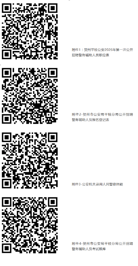 報考人員自2026年1月26日起,可通過賀州市公共就業(yè)和人才服務(wù)中心“賀州市微就業(yè)”官方微信(gxhzjy)、賀州市公安局平桂分局“平桂警方”官方微信(pggafj)查閱招聘簡章及《職位計劃表》(附件1)等相關(guān)招聘信息。