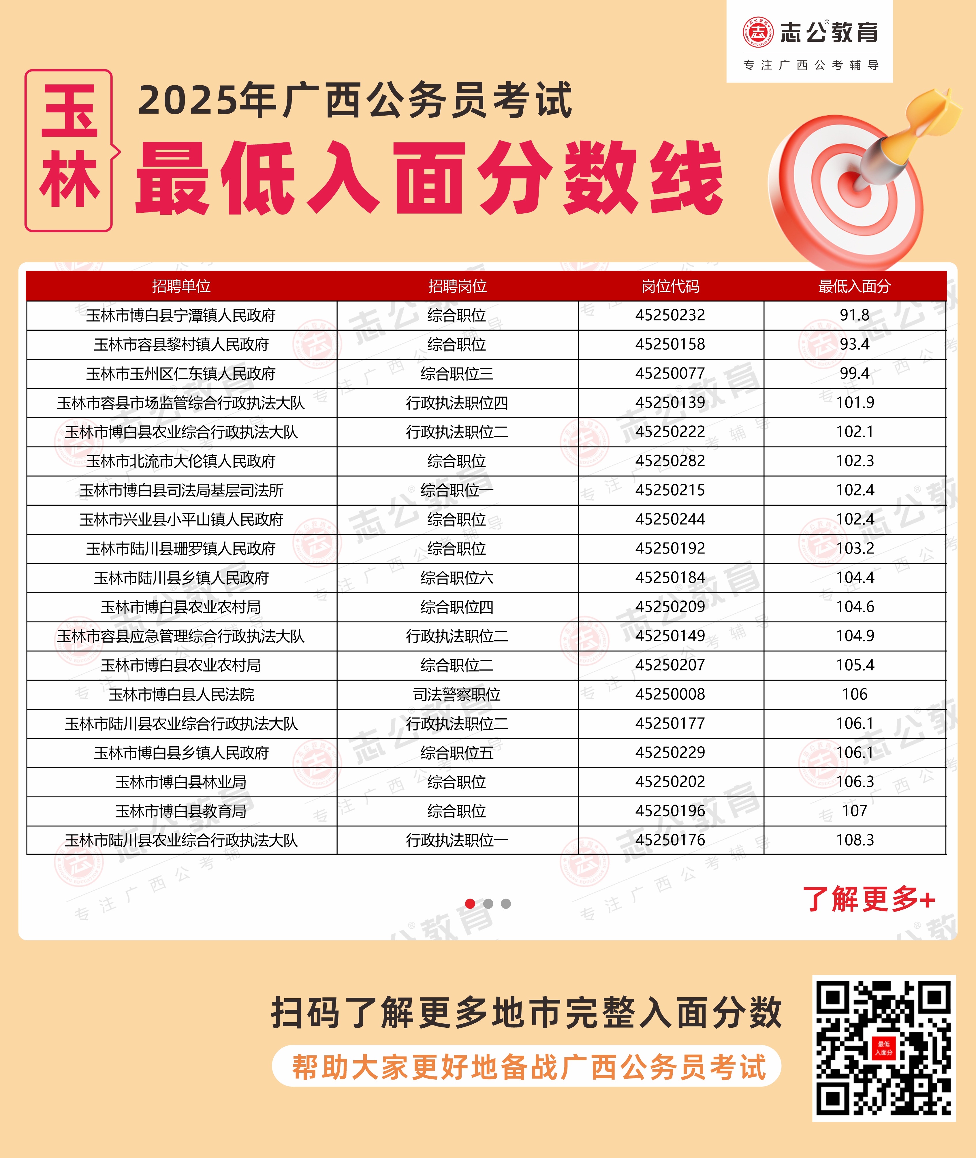 以下為志公教育根據(jù)官方發(fā)布的面試資格審查公告及公開數(shù)據(jù)整理的玉林市部分單位的進面最低筆試分數(shù)(含照顧加分),數(shù)據(jù)僅供參考,具體以官方實際公布為準。
